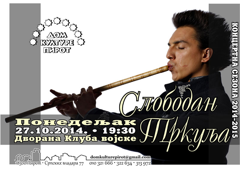 Вечерас, 27.10.2014. године, у дворани клуба војске Србије са почетком у 19:30 сати, а у оквиру Концертне сезоне Дома културе Пирот, пиротској публици ће се представити мултиинструменталиста, композитор и певач грленог и визанстијског стила СЛОБОДАН ТРКУЉА.