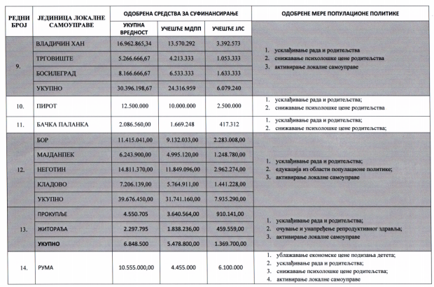 Na osnovu Predloga odluke o odobravanju sredstava za sufinansiranje mera populacione politike jedinica lokalne samouprave, ministarka Slavica Djukić Dejanović donela je Odluku o odobravanju sredstava za sufinansiranje mere populacione politike jedinica lokalne samouprave.