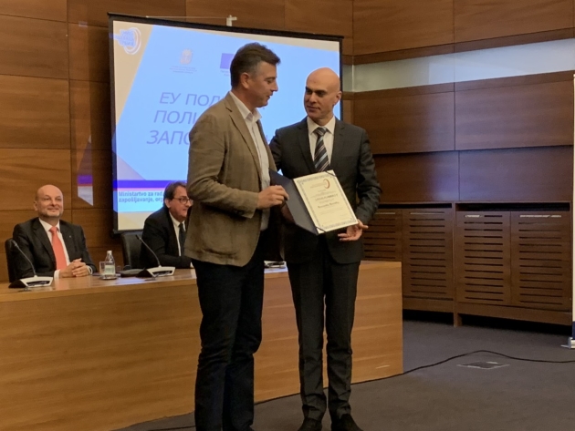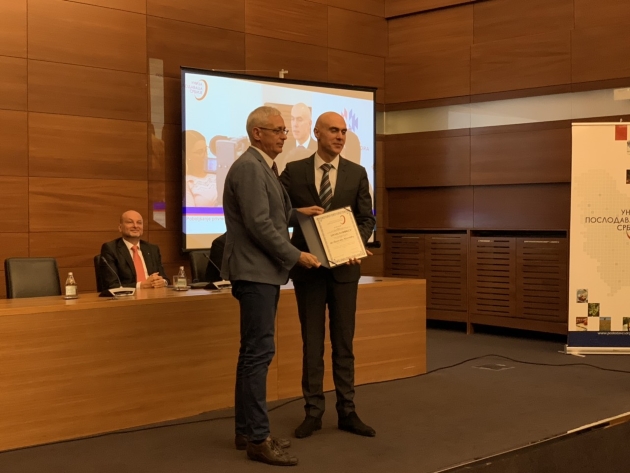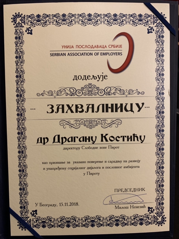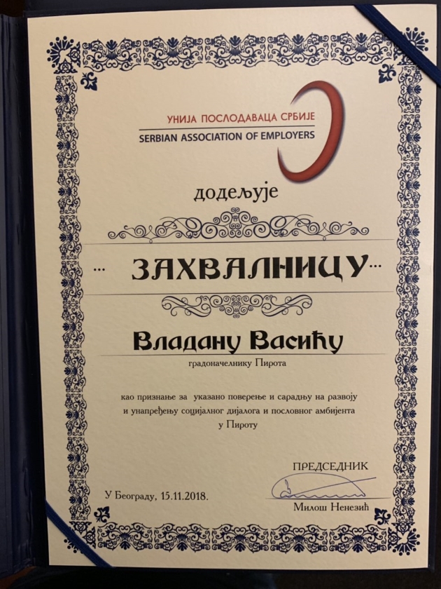 Priznanje Unije poslodavaca Srbije za ukazano poverenje i saradnju u unapređenju socijalnog dijaloga i poslovnog ambijenta u Pirotu uručeno je gradonačelniku Pirota Vladanu Vasiću i dr Draganu Kostiću, direktoru Slobodne zone Pirot.