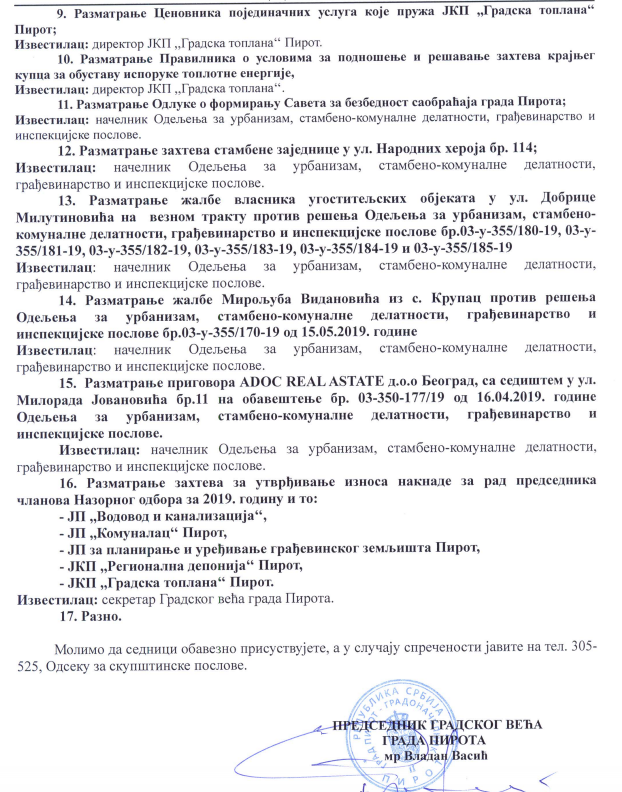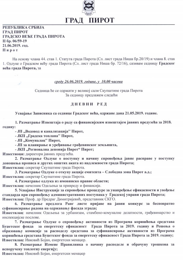 U sredu 26. juna biće održana sednica Gradskog veća. Sednica Skupštine grada Pirota zakazana je za petak, 28. jun. Na dnevnom redu će se naći davanje saglasnosti na Izveštaj o radu sa finansijskim izveštajem javnih preduzeća za 2018. godinu, donošenje Odluke o postupku i načinu sprovođenja javne rasprave u postupku donošenja propisa i drugih opštih akata iz nadležnosti grada Pirota.
