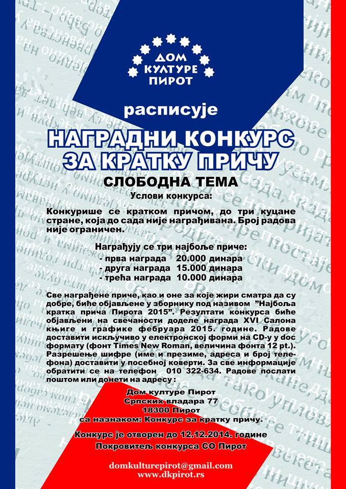 Dom kulture Pirot raspisuje NAGRADNI KONKURS ZA KRATKU PRIČU - SLOBODNA TEMA